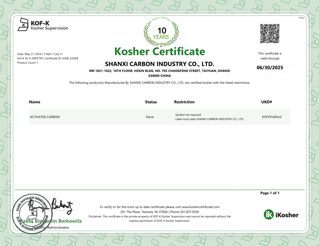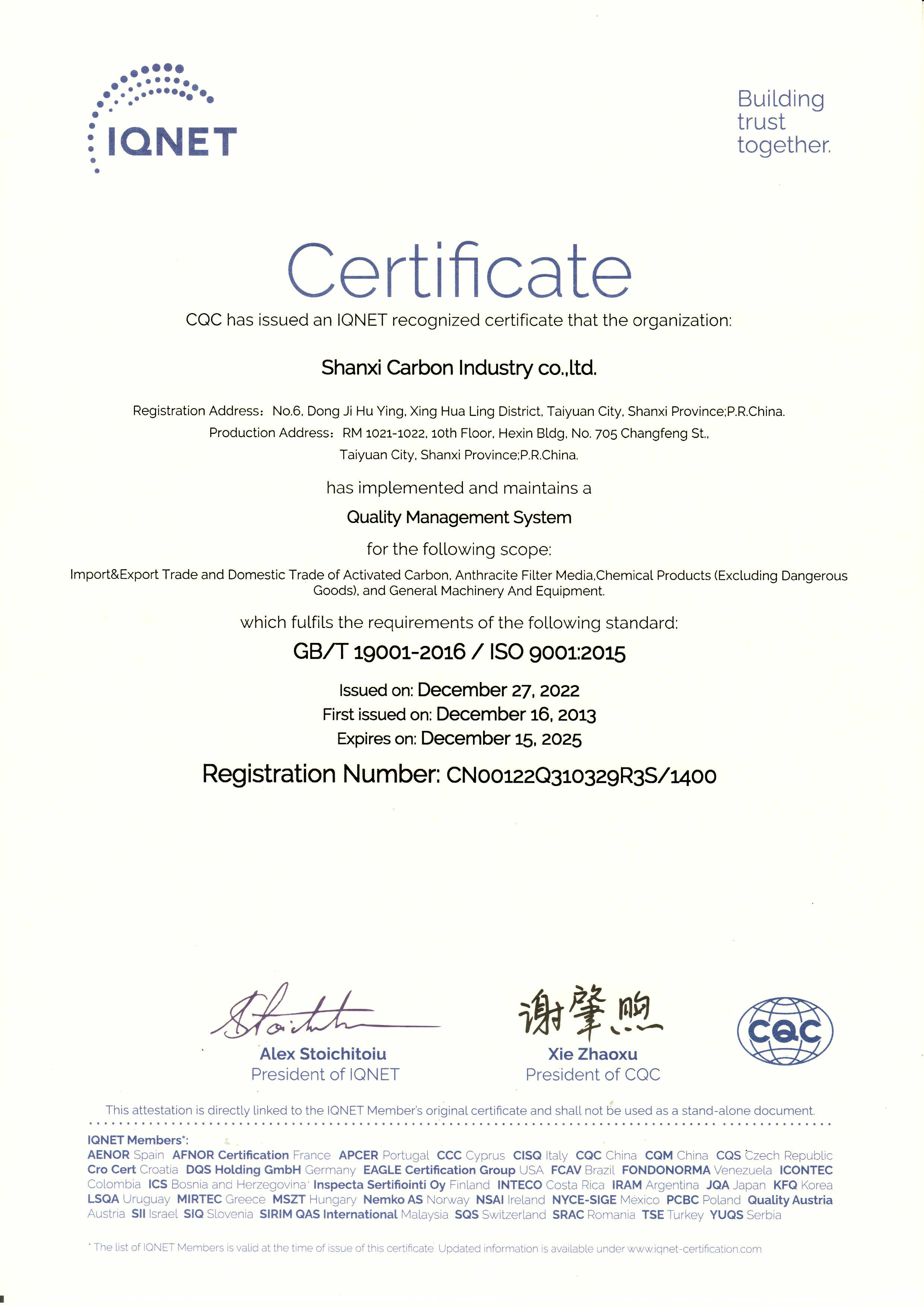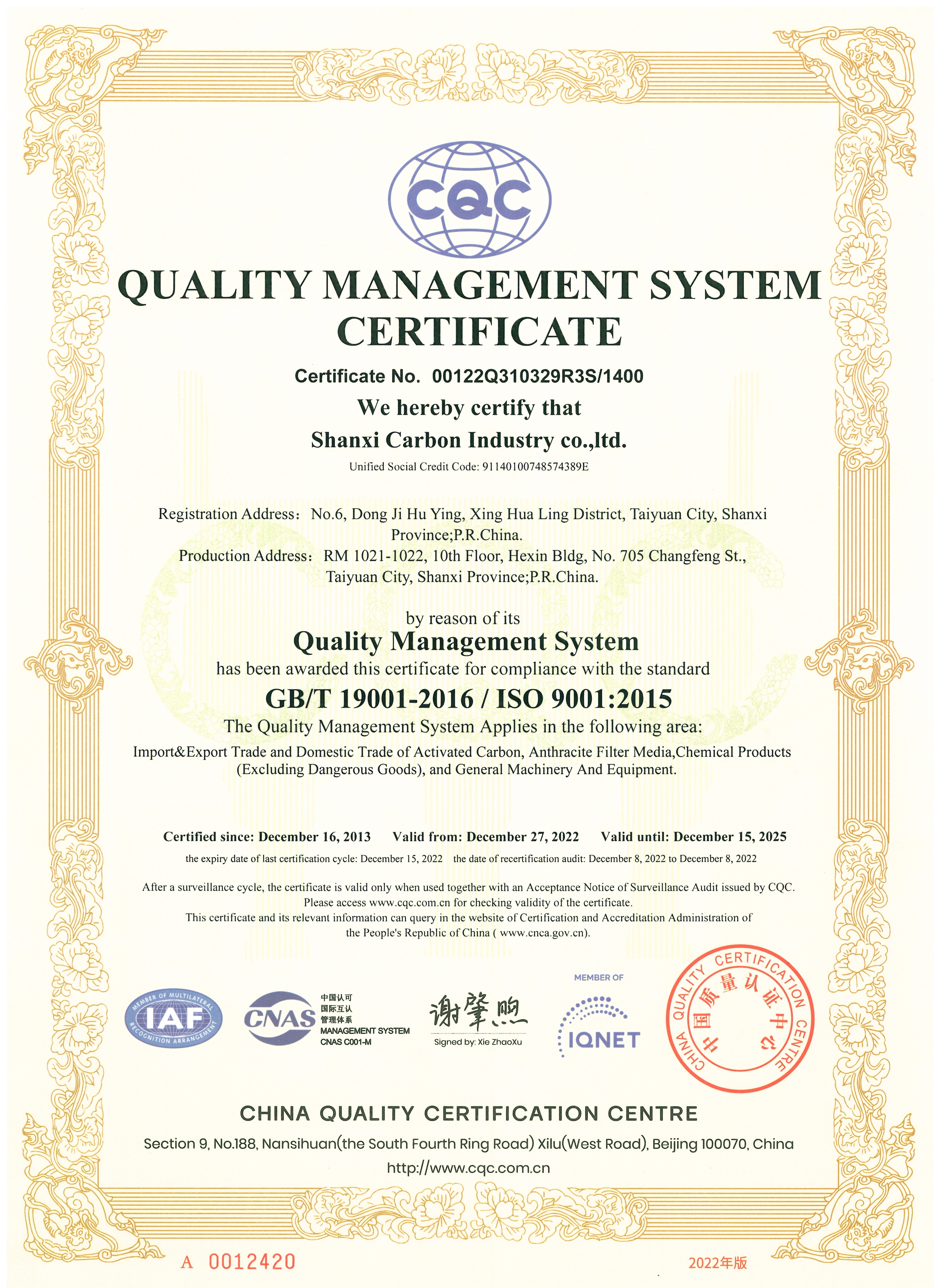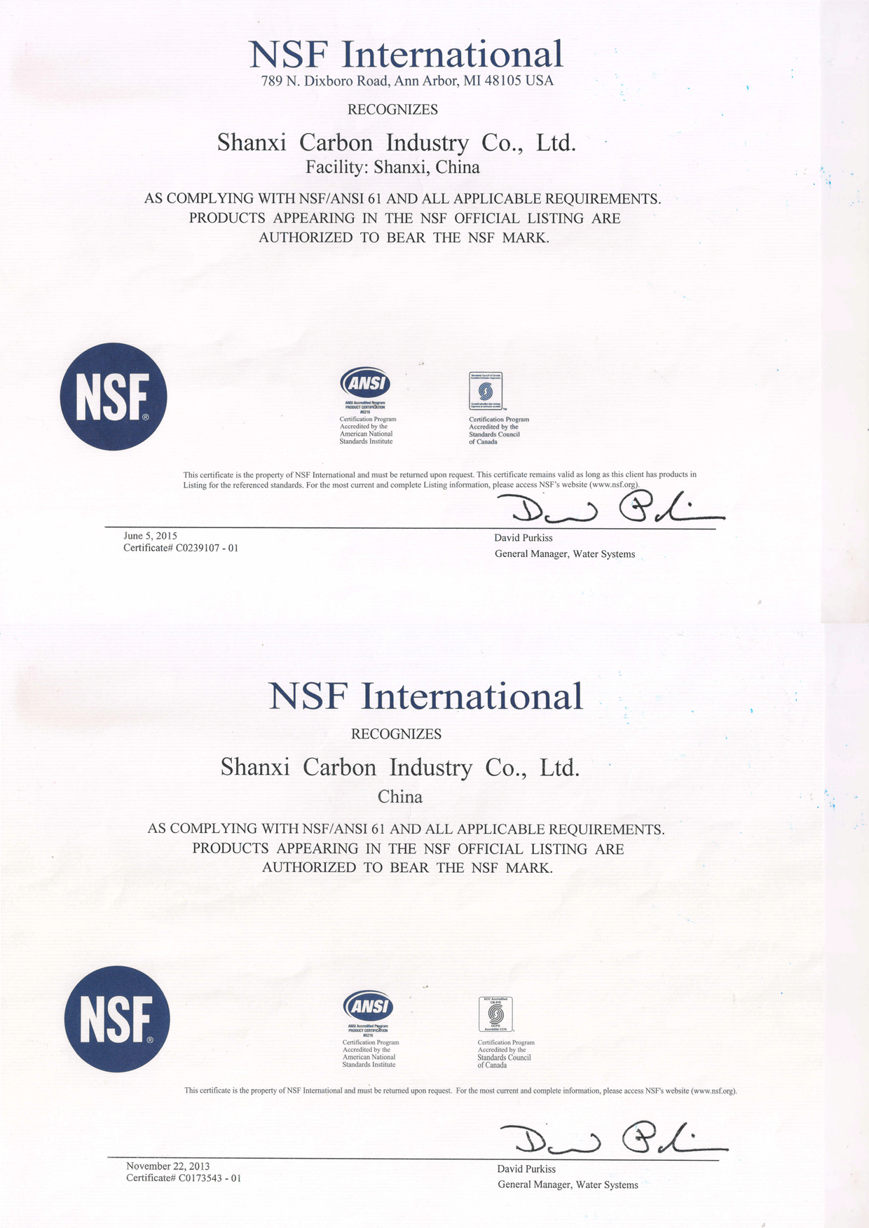 自 2003 年公司成立以来,我们持续向国际活性炭市场提供优质可靠的产品,与多家国际著名大企业保持长期友好的合作关系,并受到客户的一致认可。我们的产品品种齐全,活性炭和无烟煤滤料被广泛使用于水和空气的净化和处理、饮食业、催化剂制药业、化学和石化行业等领域。无烟煤和烟煤基活性炭采用立式活化炉生产,可加工成颗粒状、粉末状及柱状。我们致力于高质量原料的采购、稳定的生产、新产品的研发、成熟的质量控制、完美的包装、及时顺利的装运,以及售前售后的多样增值和技术服务以保质保量提供物美价廉的产品。公司先后取得 ISO9001 质量体系认证、美国NSF认证、KOF-K KOSHER 犹太洁食认证、IFANCA HALA 清真食品认证、山西省涉及饮用水卫生安全产品许可批件等证书,可最大程度满足客户的不同需求。